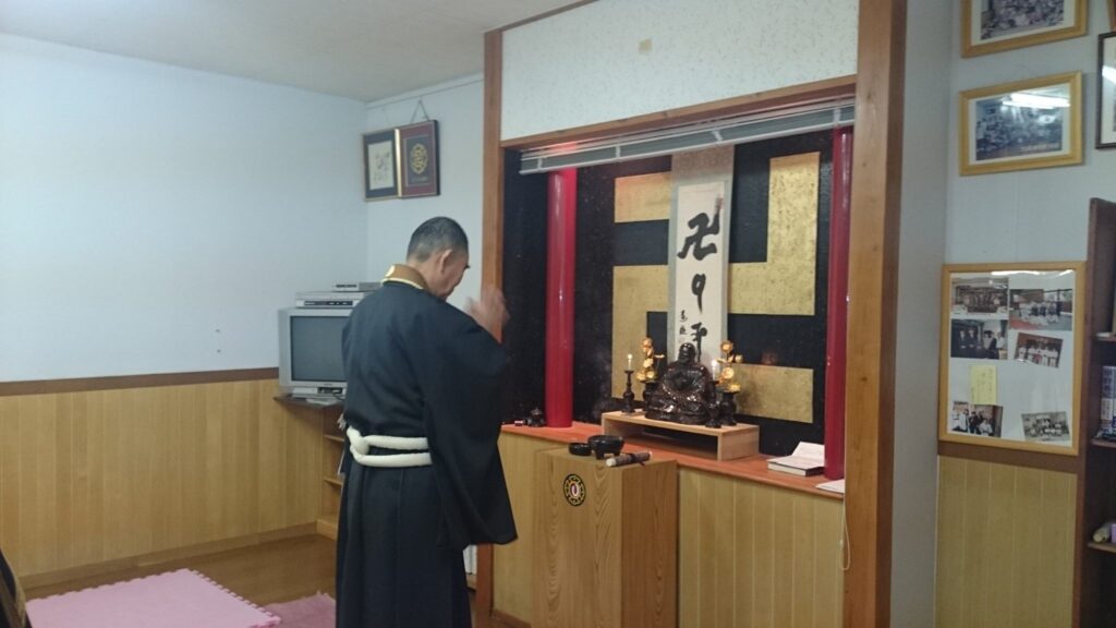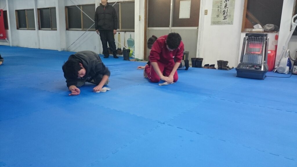 道院で夕方練習をしていた山形大学工学部の拳士も帰る間際でしたが,雑巾がけを手伝ってくれました。2回ずつ拭くことができたので,しばらくは汚れずにすみそうです。