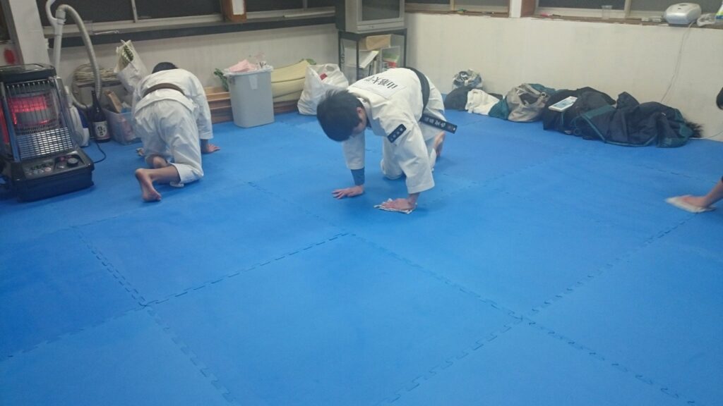 昨日は,新年会で練習を早じまいにする都合で時間が短かったため,年末にできなかったマットの雑巾がけを行いました。