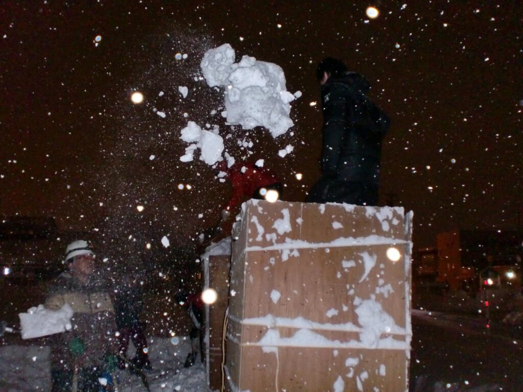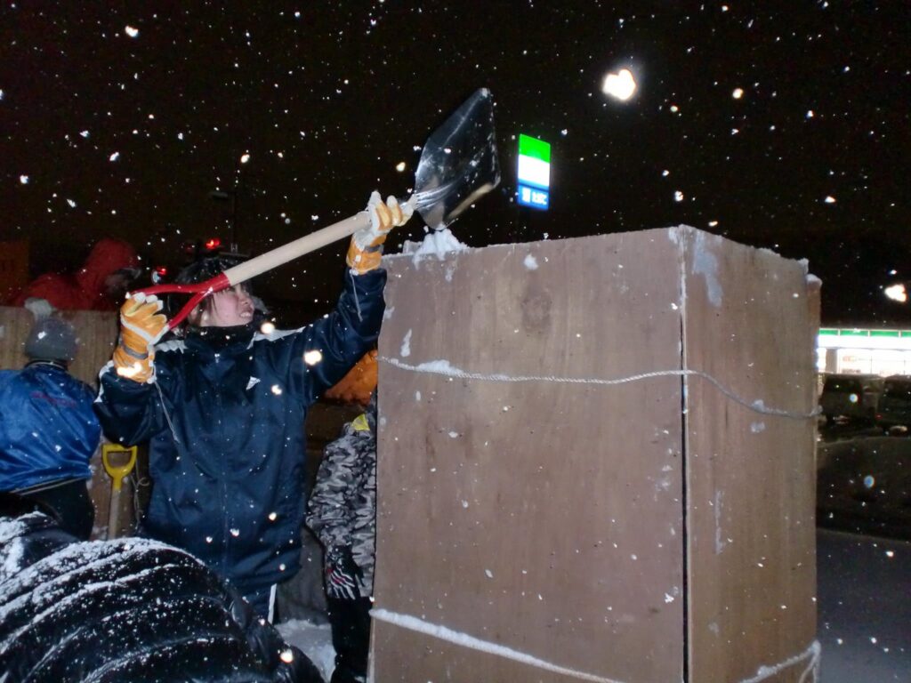 毎年恒例の米沢市上杉雪灯籠祭 投稿日時: 2015年2月9日 投稿者: izumi 今日の夜は,毎年恒例の米沢市上杉雪灯籠祭の協賛として,雪灯籠作りをしてきました。2日間かかる制作の今日は1日目。いわゆる「トーフ」作りです。コンパネ4枚をロープで縛り,上から雪をどんどん入れます。あらかじめ中に人が入り,入れてもらった雪を中で踏み固めます。工学部の拳法部員に中に入ってもらい,何とか完成。3日寝かせて金曜日に成型作業です。 ツイート